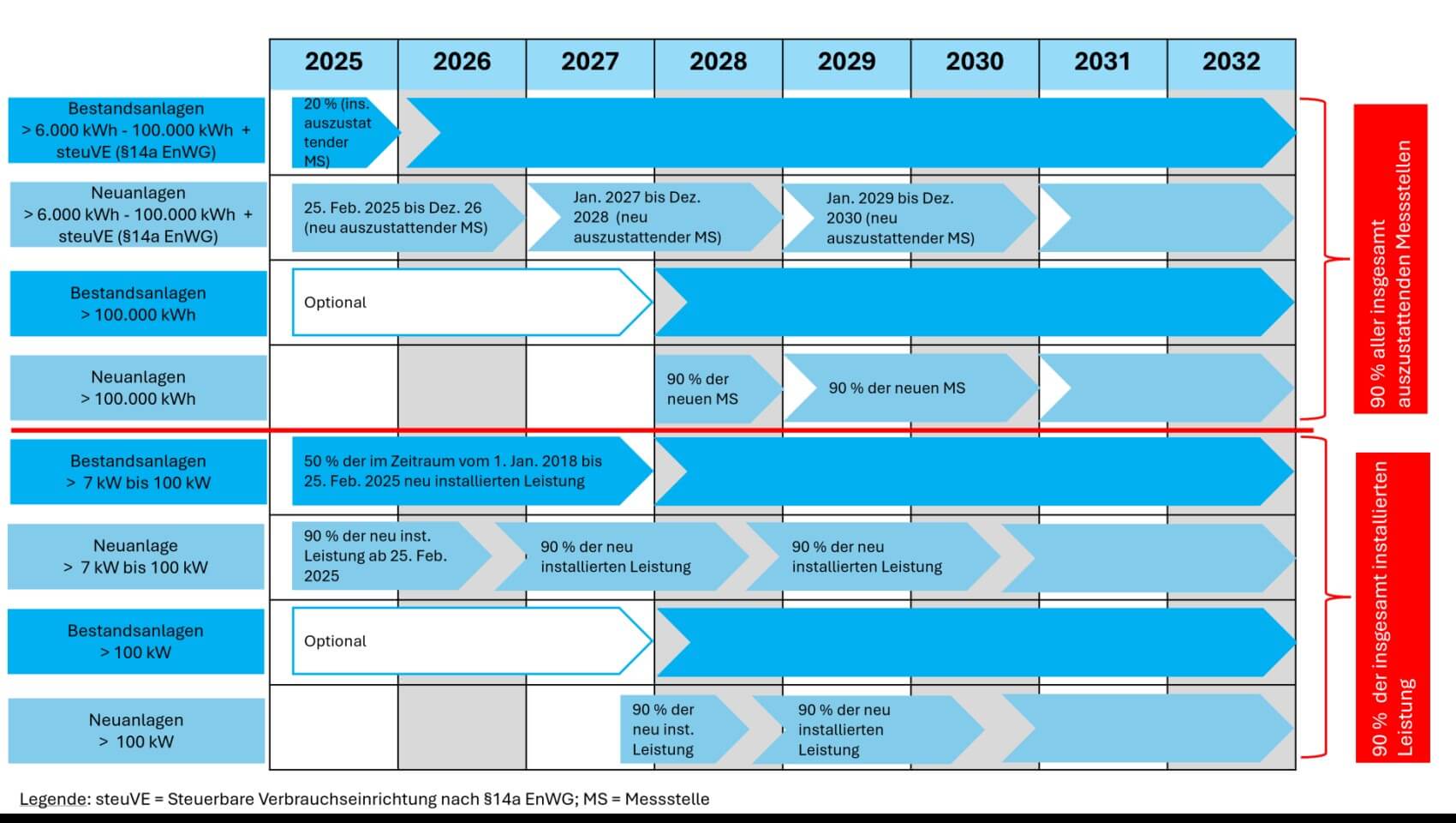 Der Rollout gliedert sich in einen Pflichtrollout sowie in einen Rollout auf Basis freiwilliger Anträge. Der Pflichtrollout wird durch das Bundesministerium für Wirtschaft und Klimaschutz (BMWK) in Verbrauchs- und Erzeugungsklassen unterteilt und ist in der folgenden Grafik skizziert. Zusätzliche Informationen erhalten Sie auf der Homepage des BMWK.